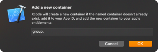 1. In App Groups, click on [+] —> Add a new container —> Enter group name —> OK.