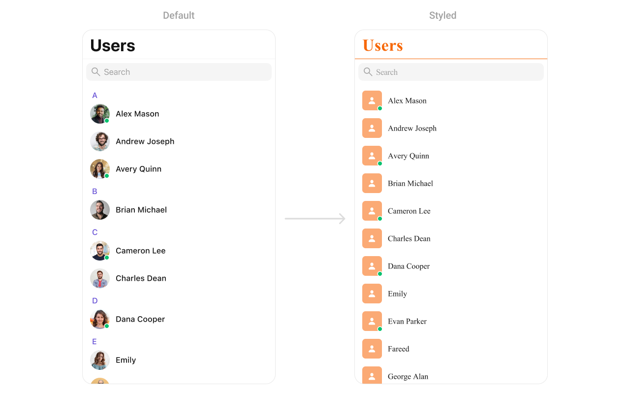 The CometChatUsers component displays a scrollable list of users, ideal for showcasing available contacts for messaging, calls, or group creation. Customization includes user avatars, status indicators, and list backgrounds, enabling alignment with your app’s design system. You can check out the list of styling properties offered by CometChatUsers